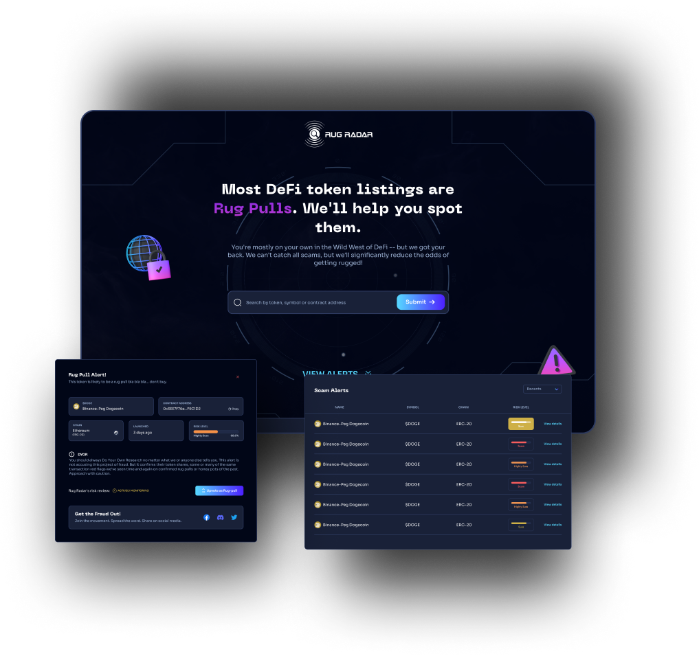 We’re on a mission to #GetTheFraudOut of crypto. Rug Radar is the most advanced, user-friendly early alert system in the world. Finally, you can safely navigate Web3 with the hard parts of DYOR taken care of autonomously by us! Read on to learn about Rug Rebates & Crisis Center.
